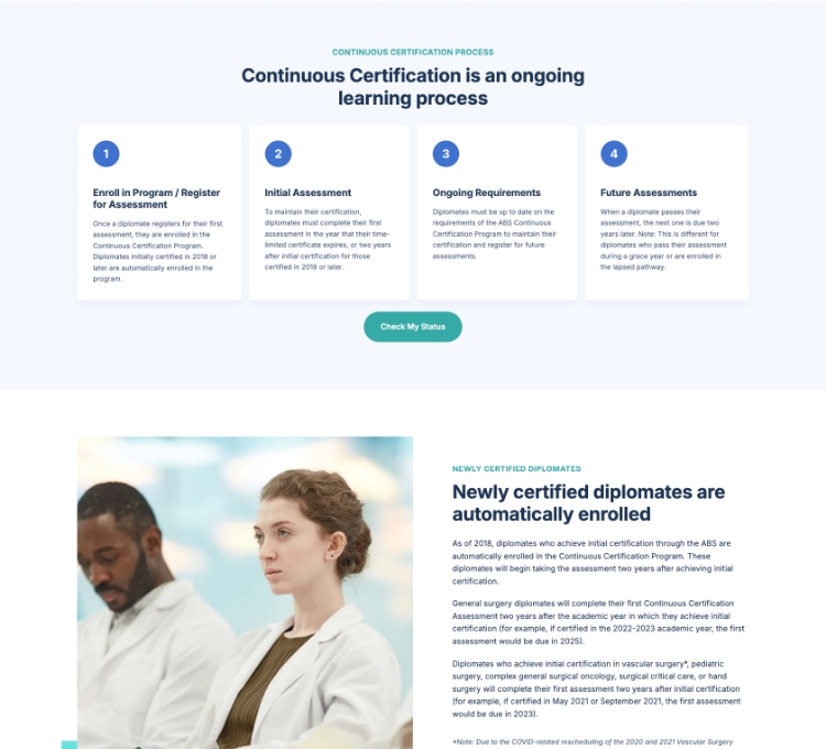 The American Board of Surgery (ABS) is an independent, nonprofit organization that provides board certification to individuals in the field of surgery. Their vast and intricate website was technically complex, difficult to navigate, and couldn't be easily edited by their team. That's why they came to our team at BNP Engage.