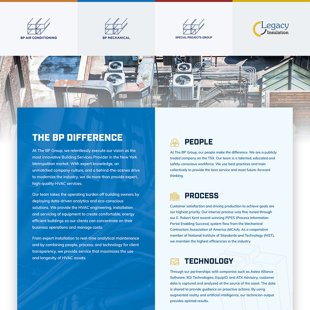 The BP Group is a leading commercial HVAC company in New York City specializing in the installation, maintenance and engineering of HVAC systems. They needed a modern website design to reflect their commitment to client satisfaction and innovative company culture. Cue BNP Engage.