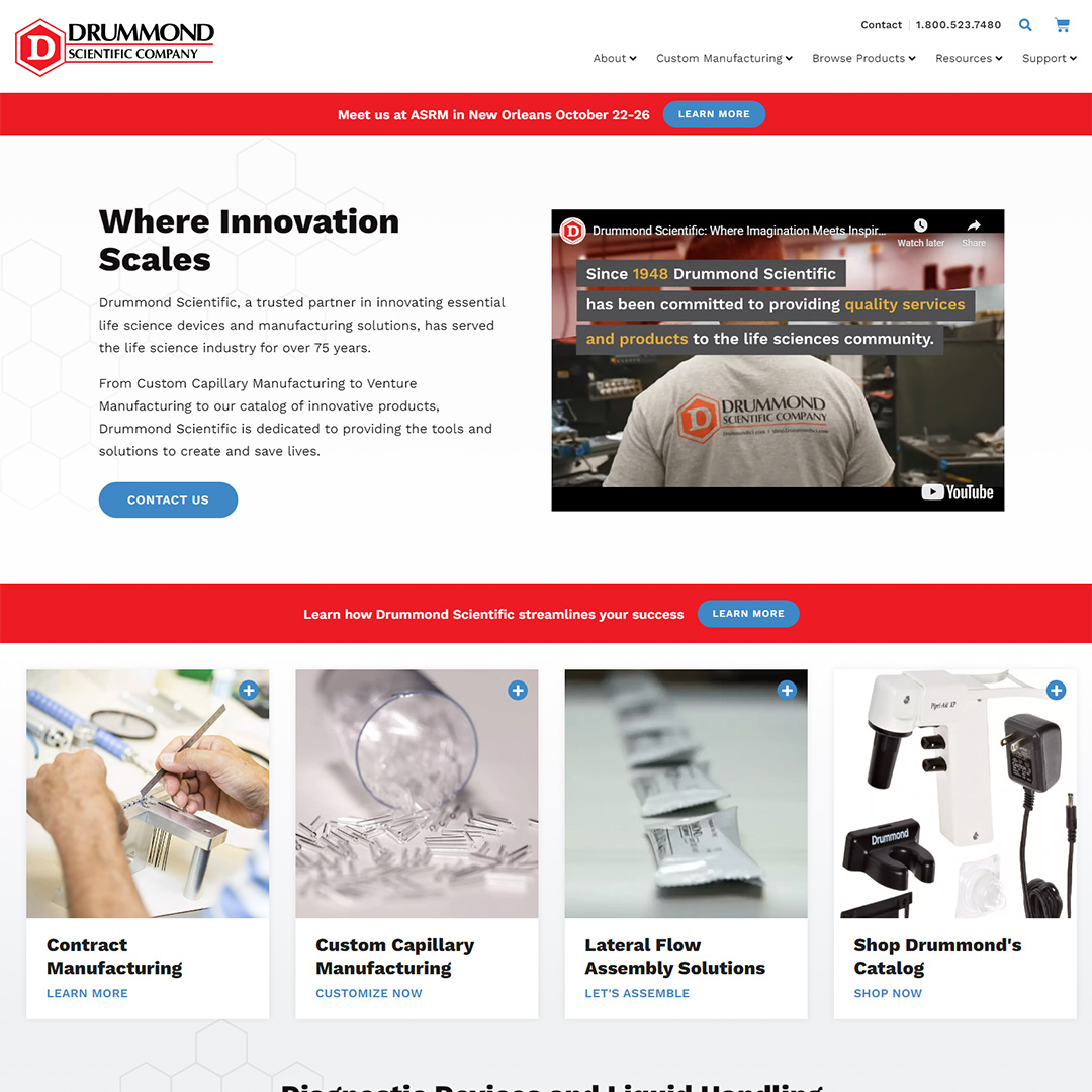 Drummond Scientific has over 75 years of history, and needed a brand and digital marketing strategy that reflected both their history and future. Before first working with BNP Engage, they did not have defined brand guidelines. Their website was built on outdated technology and did not follow SEO or User Experience best practices. They launched an eCommerce store front on a subdomain, that created confusion between their catalog site and online storefront. They also wanted to be better known in the market for their custom manufacturing and OEM services, but were struggling with reaching their ideal audiences. They needed a foundation for ongoing marketing success, focused on generating sales qualified leads.