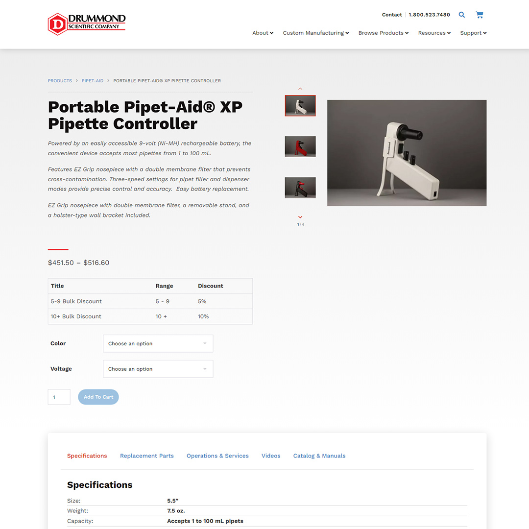 BNP Engage worked with Drummond Scientific to identify a strategy for digital marketing success. Brand guidelines, audience personas and customer journeys, and marketing campaigns were defined during a discovery and strategy phase. The ideal website information architecture was determined based on SEO data, competitor research, user experience best practices, and business requirements. The website was designed and developed on WordPress using a custom framework and site theme to accommodate the complex functional requirements for managing the full product catalog. After the launch of the website, SEO and paid search marketing was launched to promote product sales and generate custom manufacturing leads. An ongoing support and marketing roadmap ensured that Drummond Scientific had the support of a dedicated team at BNP Engage when they acquired other companies, expanded functionality on their website, and grew their internal marketing team.